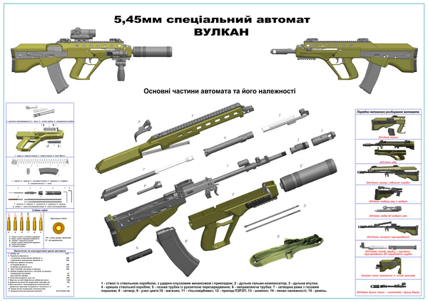 - 5,45-мм автомат «Малюк» — компактная версия с 415 мм стволом и прицельной планкой Пикатинни на ствольной коробке. Разработка автомата началась в 2005 году при участии специалистов компании ООО «Интерпроинвест» с учётом опыта, полученного при разработке автоматов «Вепр». Первый экспериментальный образец получил наименование «Вулкан-М». Второй образец, в конструкцию которого было внесено 12 изменений и усовершенствований (регулируемый отражатель стреляных гильз, защелка магазина за спусковым крючком, съемные механические прицельные приспособления, возможность установки глушителя, крепление для установки съемных сошек), получил наименование «Малюк»[21]. Был изготовлен один демонстрационный экземпляр[22]. В январе 2015 года автомат был показан ещё раз — на Гончаровском полигоне в Черниговской области, при этом на крышке ствольной коробки был установлен коллиматорный прицел[23].