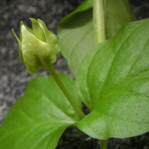 Стебель ползучий, облиственный, местами укореняющийся в узлах; его длина у взрослого растения составляет от 20 до 60 см[7]. Листья супротивные, длиной от 9 до 25 мм и шириной от 5 до 20 мм, на коротких черешках (длиной от 2 до 5 мм). Листовые пластинки яйцевидно-округлые или почти круглые (монетовидные), изредка слегка сердцевидные; могут быть как тупыми, так и заострёнными[4]; цельнокрайные, с мелкими редкими тёмными желёзками, светло-зелёные, шелковистые на ощупь[7][6]. Побеги и листья зимующие[3].