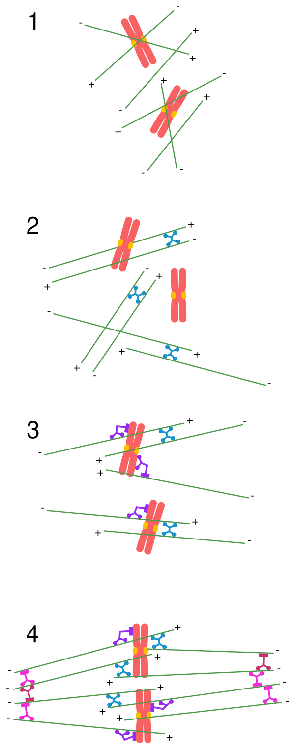 - Моторные белки семейства кинезин-5 (Eg5) связываются с двумя противоположно ориентированными микротрубочками и одновременно движутся в направлении плюс-конца каждой из них. В итоге происходит сортировка антипараллельных поляризованных микротрубочек и их «сшивка» в районе плюс-конца.