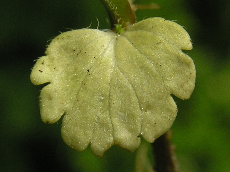 Листья округло-яйцевидные до продолговато-яйцевидных, длиной 1,5—3 см, шириной 1—2 см, туповатые, надрезанно-тупозубчатые или городчатые, редко почти перисторассечённые на тупые доли, опушённые, морщинистые, у основания округлые или почти сердцевидные. Нижние листья коротко черешчатые, остальные сидячие.