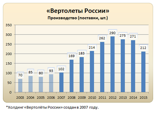 | Поставлено и произведено вертолётов (шт.) | 70 | 85 | 80 | 93 | 102 | 169 | 183 | 214 | 262 | 290 (поставки) | 275 (поставки) 303 (производство) | 271 (поставки)
