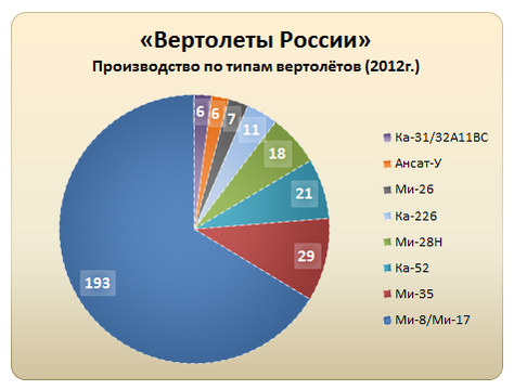 По типам вертолётов парк мировой авиации в 2012 году пополнился на 193 машины семейства Ми-8/17, 29 боевых Ми-35М и 18 Ми-28, а также 17 семейства Ка-27/32, 21 Ка-52, 6 Ансат-У и 7 Ми-26.