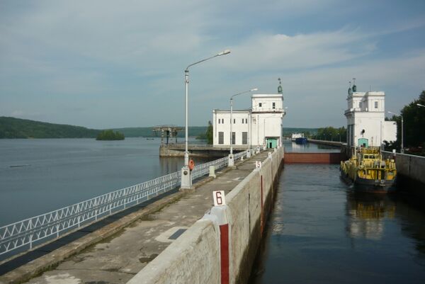 Судоходный шлюз расположен на левом берегу, между зданием ГЭС и дамбой. Шлюз однониточный однокамерный, длина камеры — 285 м (полная) и 281 м (полезная), ширина — 22 м (полная) и 21,5 м (полезная), минимальная глубина на пороге — 4,05 м. Система питания шлюза — с использованием донных галерей, время заполнения/опорожнения камеры шлюза составляет 8—9 минут. На верхней голове шлюза расположен опускной плоский затвор, на нижней голове — двустворчатые ворота. В шлюз уложено 279,6 тыс. м³ бетона. Помимо камеры, в состав сооружений шлюза входят верхний и нижний подходные каналы с дамбами, а также металлический поворотный мост. Собственником судоходного шлюза является ФБУ «Администрация Волго-Балтийского бассейна внутренних водных путей»[13][14][3][15].