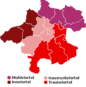 Территория земли разделена на 4 крупных района: Хаусрукфиртель, Иннфиртель, Мюльфиртель и Траунфиртель. Верхняя Австрия состоит из трёх штатутарштадтов (Линц, Вельс и Штайр) и 15 округов: