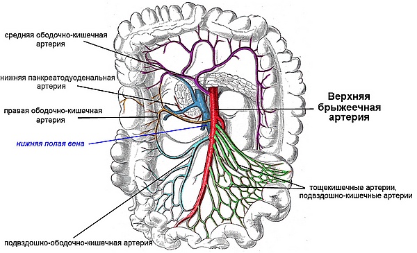 Верхняя брыжеечная артерия кровоснабжает кишечник от нижней части двенадцатиперстной кишки, две трети поперечной ободочной кишки, а также поджелудочную железу[4].