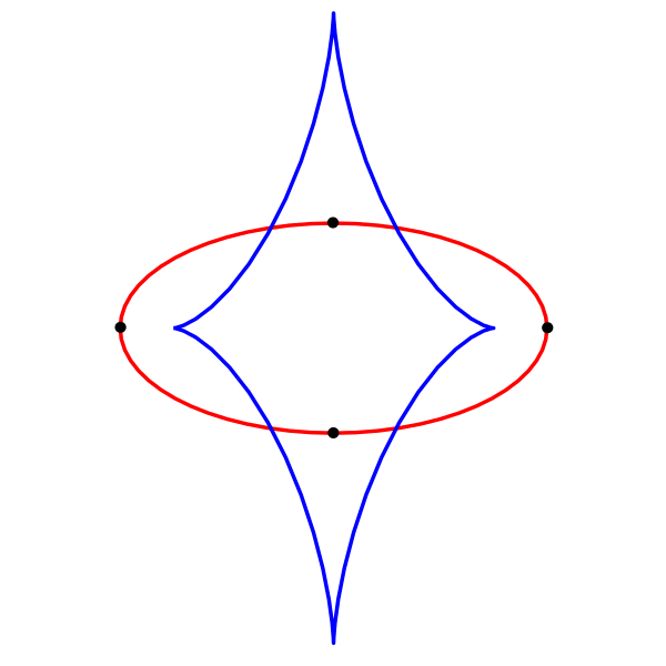 Множество симметрии кривой имеет концы в каспах, соответствующих вершинам, а срединная ось, подмножество множества симметрии, также имеет концы в каспах.
