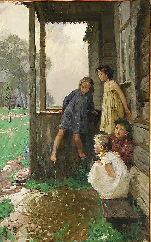 На переднем плане изображена скамья под навесом у стены дома, на которой сидят три девочки и мальчик. Перед детьми расположена лужа, окружённая зелёной травой, а возле скамейки видны два жёлтых цветка. Слева вдали изображены деревья. Сцена разворачивается во время дождя, что подчёркивает повседневный характер происходящего и соответствует традициям бытового жанра.