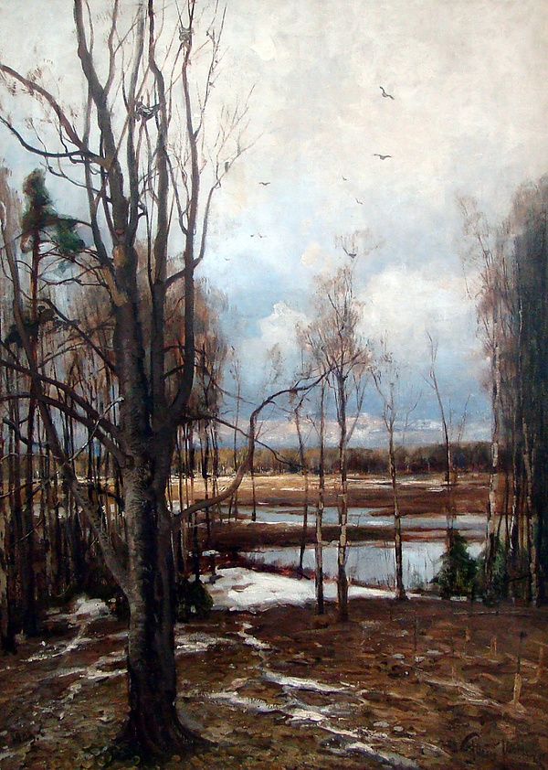 На картине изображён перелесок в начале весны. На первом плане выделяется дерево без листвы, написанное в тёмных коричневых тонах, что создаёт акцент в композиции. Второй план занимает не растаявший снег с большими прогалинами, выполненными в холодной цветовой гамме. На дальнем плане видна полоса леса, а низкая линия горизонта подчёркивает широту пространства. Небо написано в сине-серых тонах, которые в верхней части плавно переходят в более тёплые оттенки, что усиливает ощущение ранней весны, характерное для пейзажа.