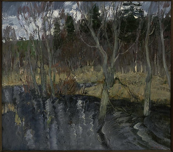 Полотно выполнено в жанре пейзажа и построено по многоступенчатой композиции. На переднем плане изображена тёмно-серая водная поверхность с крупной рябью, почти параллельной нижнему краю картины. Второй план формируют деревья у самой кромки берега, верхушки которых срезаны верхним краем изображения. За ними располагается узкая желтоватая полоса земли и массив леса. В верхней левой части видна полоса неба с яркими белыми просветами, что придаёт работе контраст и глубину цветовой гаммы.