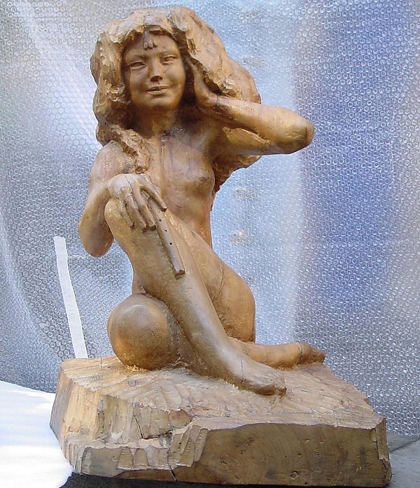 Скульптура изготовлена из дерева. Техника резьбы позволяет создать тонкие детали и передать мягкость форм. Работа с деревом требует высокой квалификации и аккуратности.