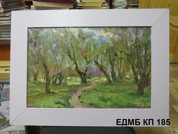 На переднем плане картины изображена дорожка, ведущая вглубь яблоневого сада. Такое построение пространства подчёркивает глубину композиции и создаёт ощущение перспективы, характерное для пейзажа.