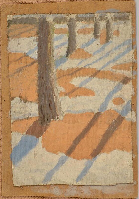 На этюде изображены стволы деревьев, верхние части которых намеренно не показаны и обрезаны композицией, что создаёт ощущение фрагментарности и акцентирует внимание на вертикалях. На поверхности снега заметны голубые тени от стволов, подчёркивающие работу с цветовой гаммой и передачу светотени. Картина относится к жанру пейзажа.
