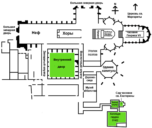 Главным входом в церковь считается Большая северная дверь, через неё посетители попадают в северный трансепт. Оттуда, свернув налево, оказываются в восточной части церкви, деамбулатории, где находятся несколько часовен (или капелл), самая большая из них — часовня Богоматери Генриха VII. Большую часть южного трансепта занимает Уголок поэтов; также здесь находится большое круглое окно-розетка, спроектированное сэром Джеймсом Торнхиллом, на котором изображены одиннадцать апостолов[6].