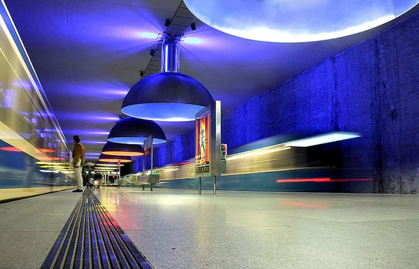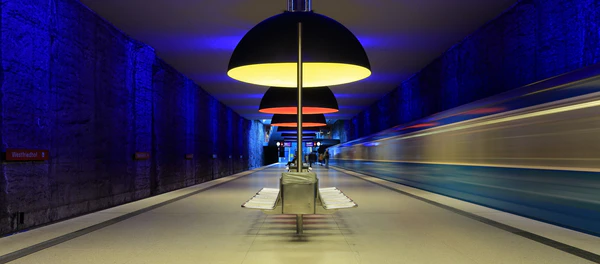 Рекламные агентства часто используют станцию в качестве объекта фотографии из-за светового дизайна, а также из-за особой атмосферы использовали в качестве обложки для пластинки.[2] Свет исходит от одиннадцати ламп, каждая диаметром 3,80 метра, которые светят красным, синим и желтым цветом. На западную часть платформы падает солнечный свет. Таким образом, платформа делится на разные цвета. Вместе с грубо-обработанными стенами станция напоминает пещеру. Изначально архитектор планировал стеклянные панели перед стенами, но так, как станция выглядит сейчас, ему понравилось больше. Тем не менее, в 2003 году стены пришлось закрепить с помощью стальной сетки, так как отдельные куски стены были ослаблены.[3]
