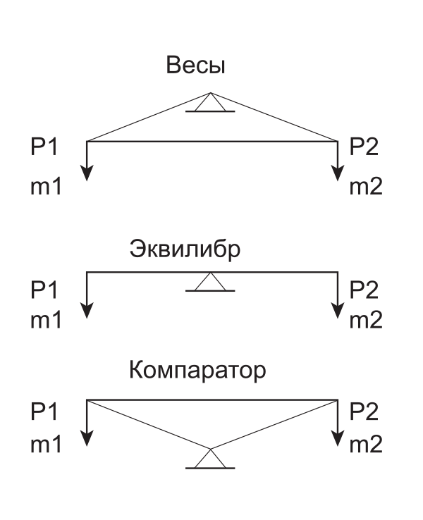 В равноплечных рычажных весах точки подвеса грузов (m1 и m2) и точка опоры образуют равнобедренный треугольник (коромысло) с высотой h и вершиной в точке опоры. При повороте равнобедренного треугольника (коромысла) на угол α одно плечо увеличивается, а другое уменьшается. Поворот коромысла останавливается при равенстве крутящих моментов: m1*l1=m2*l2, m1/m2=l2/l1, где l1и l2 — плечи крутящих моментов. Угол поворота коромысла можно отградуировать в единицах массы (количество). Чем меньше высота треугольника — h, тем меньше изменение плеч при повороте и больше чувствительность весов. Такое устройство соответствует состоянию устойчивого равновесия.