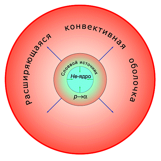 Звёзды, у которых в ядре прекратился термоядерный синтез гелия из водорода, покидают главную последовательность и переходят на ветвь субгигантов. На этой стадии синтез гелия идёт в слоевом источнике — оболочке вокруг инертного гелиевого ядра. После ветви субгигантов звезда переходит на ветвь красных гигантов, на которой также синтезирует гелий в слоевом источнике, но, в отличие от ветви субгигантов, на этой стадии звезда имеет протяжённую конвективную оболочку[4][10].