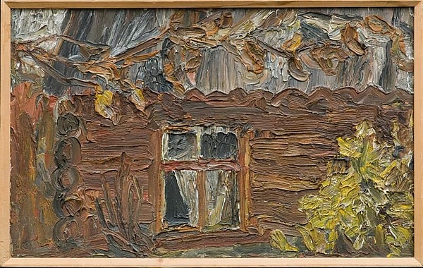 На полотне представлен бревенчатый дом, в центре которого выделяется окно, являющееся важным элементом композиции. По верхнему краю изображения проходит горизонтальная ветка дуба на фоне серой крыши, покрытой шифером. В правом нижнем углу находится желто-зелёный куст, вносящий дополнительный цветовой акцент в пейзаж.