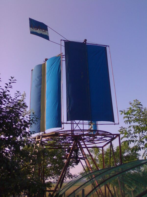 - Ветротурбины, установленной на мачте с растяжками и раскручиваемой ротором либо лопастями;