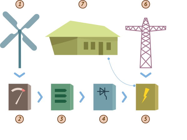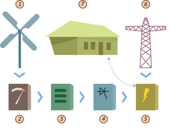 Некоторые современные бытовые ИБП имеют модуль подключения источника постоянного тока специально для работы с солнечными батареями или ветрогенераторами. Таким образом, ветрогенератор может быть частью домашней системы электропитания, снижая потребление энергии от электросети.