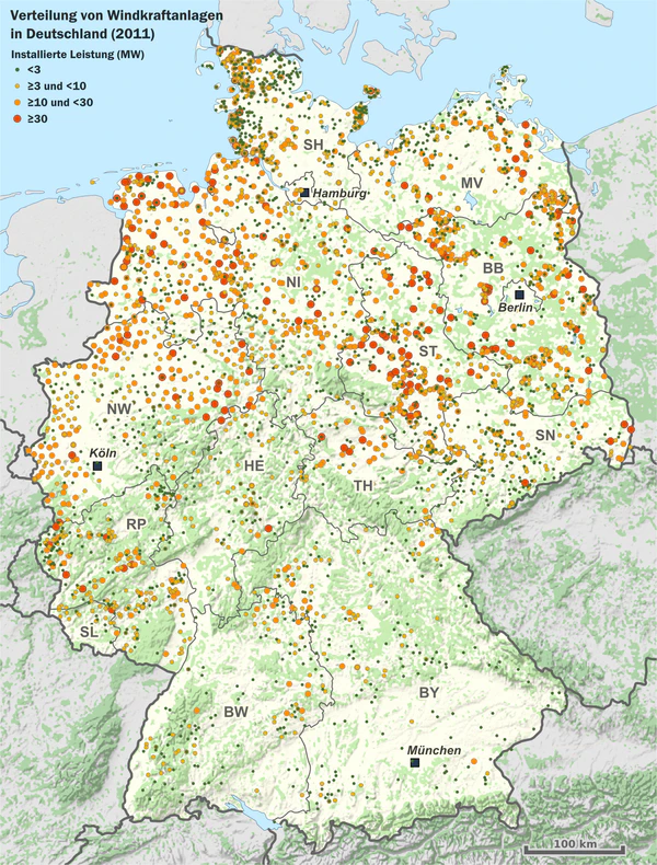 В 2011 году 8 % электроэнергии Германии было получено из энергии ветра[6]. Производство электричества ветроэлектростанциями сильно зависит от погодных условий. Так, в апреле 2011 года суммарная мощность ветроэнергетики Германии колебалась от менее 1000 МВт до 19000 МВт[6]. Ночью 7 февраля 2011 года ветряные электростанции выработали около 1/3 электроэнергии Германии[7].