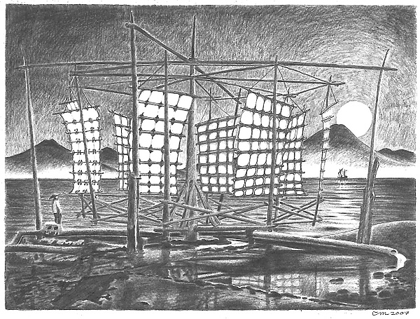 Первые мельницы изготавливались из шести-двенадцати парусов, покрытых тростниковым матом или тканевым материалом. Эти ветряные мельницы использовались для измельчения зерна или сбора воды и весьма отличались от более поздних европейских вертикальных ветряных мельниц. Ветряные мельницы широко использовались на Ближнем Востоке и в Центральной Азии, а затем распространились оттуда в Китай и Индию[6]. Подобный тип горизонтальной ветряной мельницы с прямоугольными лопастями, используемый для орошения, также можно найти в Китае XIII века (во времена династии Чжурчжэнь на севере), который стал строиться после путешествий Елюя Чуцая в Туркестан в 1219 году[7].