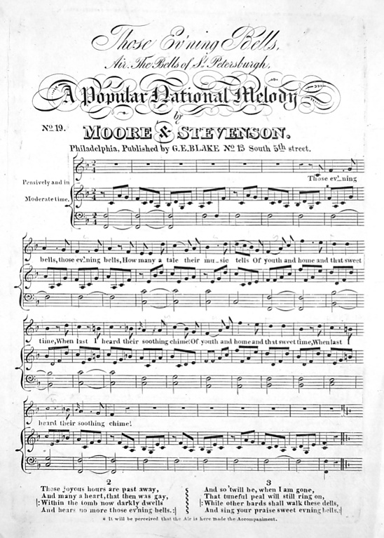 Судя по авторскому подзаголовку «Air: The bells of St.Petersburg», «мелодия, к которой был приспособлен текст Мура, имела русские истоки в виде некоей „мелодии“ о „колоколах Петербурга“. При встрече с А. И. Тургеневым в Бовуде Томас Мур, получая в дар сборник „Стихотворений“ Козлова, оставил своему собеседнику на память собственноручную запись „Those evening Bells“, из чего можно заключить, что А. И. Тургенев расспрашивал английского поэта о стихотворении „Those evening Bells“, его возможных русских истоках, однако подробности этого разговора неизвестны»[8].