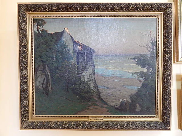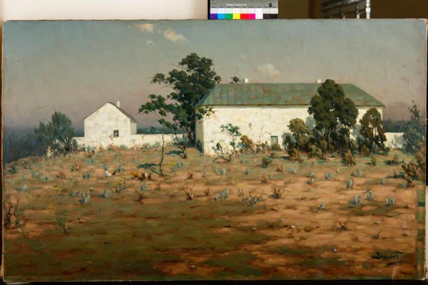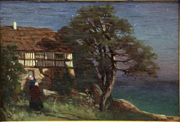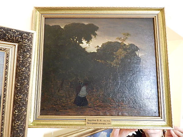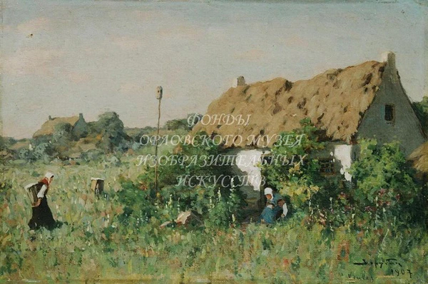 Работа выполнена в жанре пейзажа. На переднем плане изображён песчаный двор на небольшом возвышении, поросший травой и усаженный отдельными кустиками растений; среди них в центре расположены куры и петух. Позади двора расположены два белых каменных здания с зелёными крышами, разделённые белым каменным ограждением; рядом с ними растут несколько высоких кустов и деревьев. Здания освещены заходящим солнечным светом на фоне вечернего неба. В правом нижнем углу картины находится подпись художника: «Зарубинъ 1897 г.».