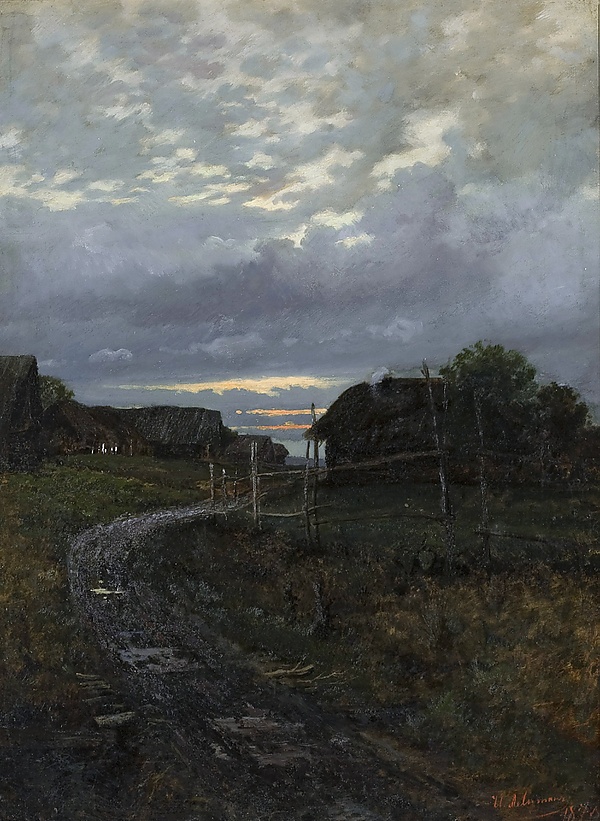На картине изображена нищая и заброшенная деревня. На фоне сизого вечернего неба выделяются тёмные силуэты полуразвалившихся изб, обнесённых ветхим забором. Между избами проходит грязная дорога с лужами, в которых видны отблески предзакатного неба[2].