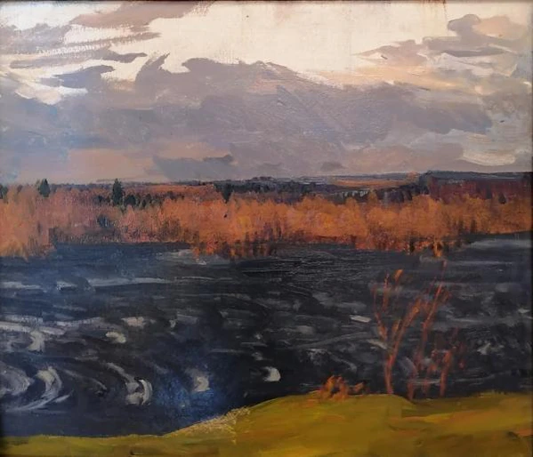 На картине изображена река с небольшой волной, занимающая передний план композиции. На противоположном берегу располагаются жёлтые заросли, которые выделяются на фоне окружающего пейзажа. Слева небо окрашено в розовые оттенки, что придаёт работе характерную цветовую гамму.