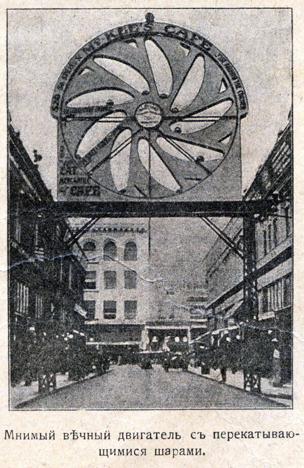 На рис. 1 показана одна из древнейших конструкций вечного двигателя. Она представляет зубчатое колесо, в углублениях которого прикреплены откидывающиеся на шарнирах грузы. Геометрия зубьев такова, что грузы в левой части колеса всегда оказываются ближе к оси, чем в правой. По замыслу автора, это, в согласии с законом рычага, должно было бы приводить колесо в постоянное вращение. При вращении грузы откидывались бы справа и сохраняли движущее усилие.