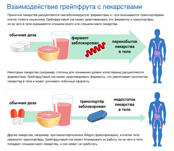 При оральном приёме лекарства растворяются и всасываются в тонком кишечнике, а также иногда в желудке. Для того, чтобы попасть в кровь, медикамент должен пройти слой эпителиальных клеток просвета кишечника, после чего он оказывается в воротном круге кровообращения и распространяется по организму. Затем лекарства метаболизируются специфическими ферментами, прежде всего в клетках печени: ферменты превращают лекарства в метаболиты. Основной задачей метаболизма является избавление от вещества, его инактивация, превращение в растворимое соединение и подготовка к выделению[26]. В результате метаболизма концентрация лекарства, уже попавшего в кровь, постепенно снижается. Ингибирование ферментов грейпфрутовым соком происходит в оболочке кишечника, а не в печени[27].