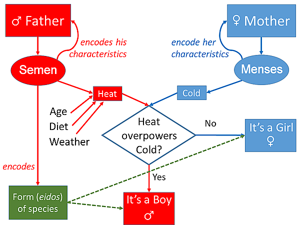 В своих представлениях о наследовании Аристотель опирался на концепцию гилеморфизма, стремясь объяснить, как характеристики родителей передаются ребёнку под влиянием окружающей среды[4]. Согласно его представлениям, сперма отца и менструация матери кодируют их родительские характеристики[4]. При этом схема наследования характеристик частично асимметрична, поскольку только характеристики отца определяют эйдос будущего ребёнка, в то время как движения флюидов отца и матери определяют другие его черты, такие как цвет глаз или форма носа[4]. Аристотель считал, что женское тело хорошо приспособлено для размножения, следовательно, его температура отличается от температуры мужского тела[5]. При этом, по его мнению, если сперма достаточно горячая, чтобы подавить холодную менструацию, то будущий ребёнок будет мальчиком; но если она холодна, ребёнок будет девочкой. Таким образом, по Аристотелю, наследование является частичным, как в менделевской генетике, в отличие от модели Гиппократа, которая описывает смешанное наследование[4]. На пол будущего ребёнка могут влиять различные факторы, влияющие на температуру отцовской спермы, в том числе погода, направление ветра, диета и возраст отца. Другие характеристики ребёнка, помимо пола, также зависят от того, преобладает ли сперма над менструацией, поэтому, если у мужчины сильная сперма, у него будут сыновья, похожие на него, а если сперма слабая, у него будут дочери, похожие на их мать[4].