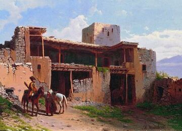 И. К. Айвазовский: «Аул Гуниб в Дагестане» (1869). Вид с Кегерских высот, где во время осады Гуниба располагался командный пункт русской армии. |