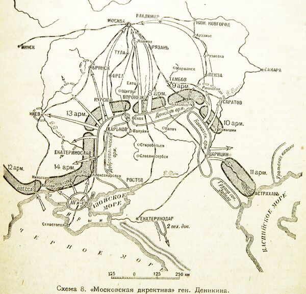 «Предпринимая наступление в направлении Киева, я имел в виду огромное значение соединения Добровольческой армии с польскими силами, наступающими к линии Днепра. Это соединение выключило бы автоматически весь западный фронт и освободило бы значительную часть сил Киевской и Новороссийской областей для действий в северном направлении. Наступление польских войск к Днепру отвлекло бы серьёзные силы большевиков и обеспечило бы надёжно с запада наши армии, идущие на Москву. Наконец, соединение с поляками открывало нам железнодорожные пути в Западную Европу — к центрам политического влияния и могущества, к источникам материального питания армии»