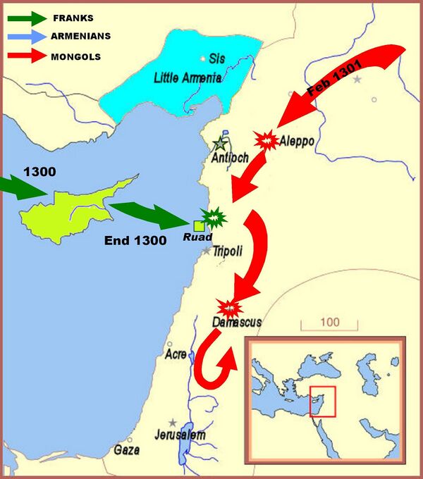 "Царь Армении послал гонцов к царю Кипра сказать ему ... что Газан был теперь на грани вступления в земли султана с множеством татар. Зная это, мы теперь намерены перейти на остров близ Тортосы, где оставался весь этот год наш гарнизон с лошадьми и оружием, причинив большой ущерб сарацинам. Мы намерены пойти туда и поселиться в ожидании татар"