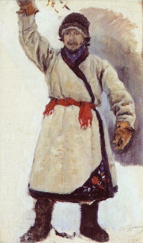 Среди защитников городка выделяется фигура крестьянина в белой шубе, подпоясанного красным кушаком[84]. Его румяное лицо «озарено улыбкой и светится от удовольствия и восхищения ловкостью торгашинского казака». Он высоко поднял руку с хворостиной, но не собираясь ей ударить, а уже приветствуя победителя[78]. По сравнению с живописным этюдом «Крестьянин с хворостиной»[85], в окончательном варианте художник изобразил крестьянина «более молодым, жизнерадостным, охваченным весёлым упоением жизни»[84]. Другой защитник, в рыжем тулупе, настолько сильно замахнулся для удара, что в азарте у него слетела с головы шапка[78].