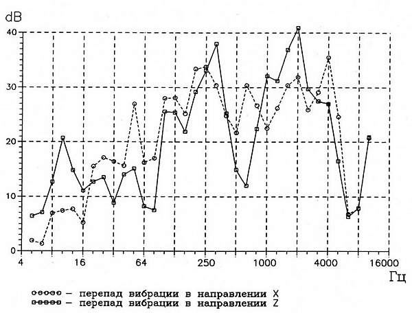 Виброизоляция опорной связи реализована в устройстве, называемом виброизолятор (виброопора). На иллюстрации представлена зависимость перепада уровней вибрации (передаточная функция), которая измеряется до и после виброизолятора в широком диапазоне частот.