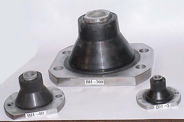 Виброизолятор (англ. vibration-isolator, antivibration part) — виброизолирующее устройство для отражения и поглощения волн колебательной энергии, распространяющихся от работающего механизма или электрооборудования, за счет использования эффекта виброизоляции. Устанавливается между телом, передающим колебания, и телом защищаемым (например, между механизмом и фундаментом). На иллюстрации представлено изображение виброизоляторов серии «ВИ», которые применяются в судостроении России, например, на подводной лодке «Санкт-Петербург». Показаны «ВИ» с допускаемыми нагрузками 5, 40 и 300 кг. Они отличаются размерами, но имеют подобную конструкцию. В конструкции использована резиновая оболочка, которая армирована пружиной. Резина и пружина прочно соединены в процессе превращения сырого каучука в резину методом вулканизации. Под действием весовой нагрузки механизма оболочка деформируется, причем витки пружины сжимаются или раздвигаются. При этом в поперечном сечении пруток пружины, скручиваясь, взаимодействует с материалом оболочки, вызывая в ней деформации сдвига. Известно, что виброизоляция в принципе не может осуществляться без наличия вибропоглощения. А величина деформации сдвига в упругом материале виброизолятора является определяющей для оценки эффективности вибропоглощения. При действии вибрации или ударных нагрузок деформации увеличиваются, являясь при этом циклическими, что значительно усиливает эффективность данного устройства. В верхней части конструкции предусмотрена втулка, а в нижней фланец, с помощью которых виброизолятор крепится к механизму и фундаменту.