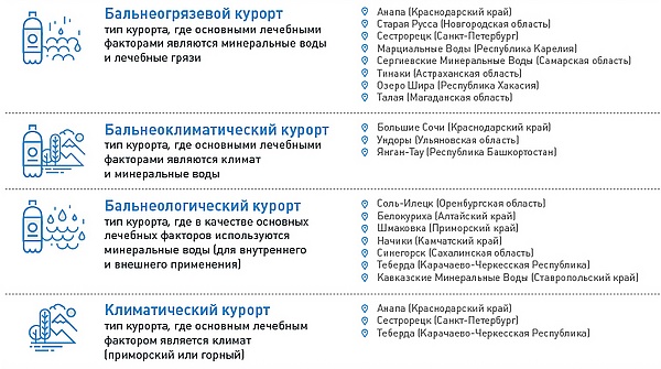 Путешествия с целью лечения изучает санаторно-курортный туризм и объединяет усилия врачей, химиков, геологов, климатологов, горных инженеров и гидрогеологов в изучении лечебных местностей[11]. Виды российских курортов[55]: