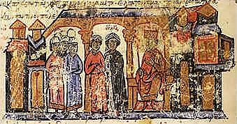 Исключительность власти византийского василевса была подчеркнута и великолепием церемониала и столицы, порядка приёма иностранных послов. Вот как описывает приём послов, Лиутпранд, посол итальянского короля Беренгара, в Константинополе в 949 г.[1]: