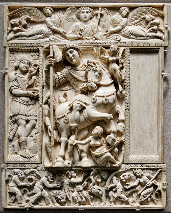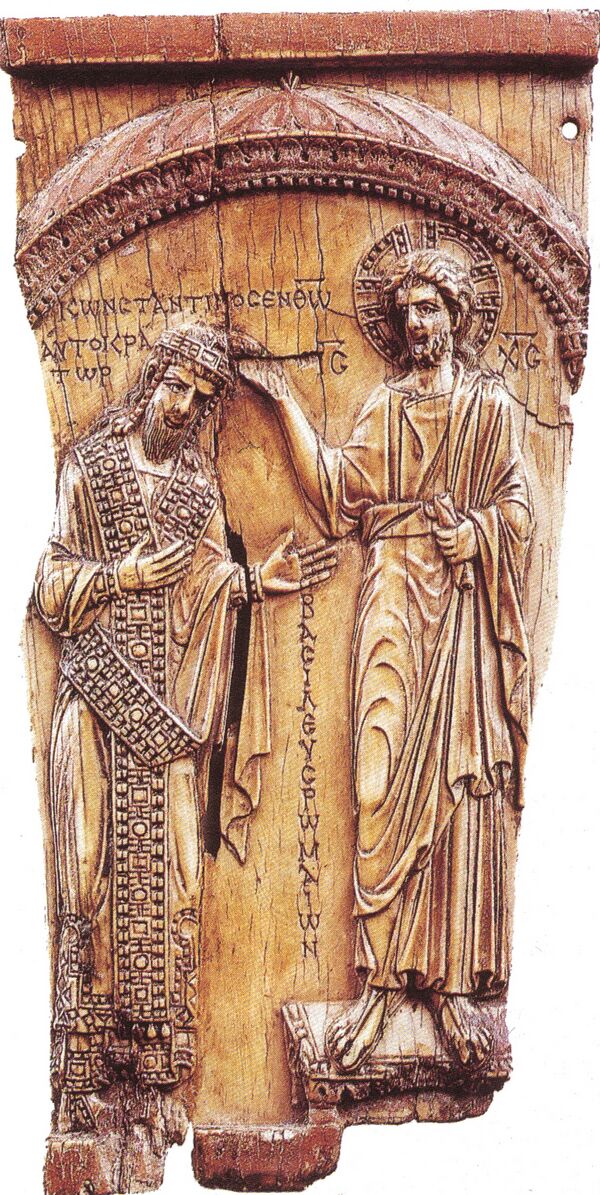 Интересные свидетельства новой идеологии царства мы подчас находим в маленького размера пластинах слоновой кости. Поскольку, возможно, они создавались для ограниченного хождения, они часто отражают более интимный взгляд на общественную церемонию коронации и торжеств, которые горожане видели на ипподроме и в соборе. На коронационном портрете 945 года император Константин VII Багрянородный (ГМИИ) представлен коронованным самим Христом. На аналогичном по тематике, но более раннем портрете на слоновой кости (т. н. Диптих Барберини) император (Юстиниан ?) коронуется им же, но Христос благословляет императора из заоблачных высей. При сравнении видно, что на портрете Константина Христос помещен с императором в одном пространстве и сам надевает на него корону. Это важное нововведение: божественное освящение делает императора полноправным посланцем Небес на земле. Это изменение отражает общую сакрализацию церемонии коронации императора.