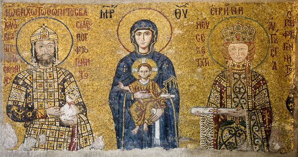 Иоанн II, чтобы быть уверенным в будущем своего старшего сына Алексея, провозгласил его соимператором и в 1122 году повелел добавить его изображение в созданные ранее мозаики южной галереи Святой Софии. Иоанн II и его жена Ирина стоят по бокам от Богоматери. У императора в руках мешок с золотом (как символ его щедрости и филантропии), его обычное приношение при посещении собора. Императорская семья стоит в непосредственной близости и в присутствии Богоматери, причём люди изображены в одном с небожительницей масштабе. Контраст между фигурами при этом примечателен: благодаря использованию теней и приданию объёма фигурам и ликам Богоматери и Младенца, они выглядят гораздо более реалистично, чем императорская семья. Императорская чета имеет вид жесткий, сухой, и своего рода бесплотный, и поражающие своей дороговизной облачения и регалии оказываются более значительными, чем их личность. Иоанн Комнин и Алексей, изображенный в боковом простенке, справа от Ирины, одеты одинаково, что ещё раз демонстрирует легитимность последнего как наследника. Надписи вокруг его фигуры подчеркивают то, что он, как и его отец является багрянорождённым — то есть имеет все законные основания быть императором.