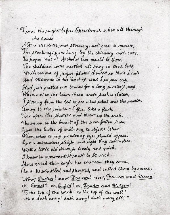 В настоящее время существует четыре рукописных экземпляра стихотворения, три из них находятся в музеях, в том числе один — в библиотеке Нью-Йоркского исторического общества[2]. Четвёртый экземпляр, который Мур преподнёс в подарок другу в 1860 году, был продан на аукционе в 2006 году за $280 тысяч некоему анонимному покупателю из Нью-Йорка, о котором известно только то, что он является «главным исполнительным директором медиакомпании»[3].