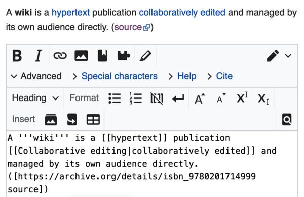 - Особый язык разметки — так называемая вики-разметка, которая позволяет легко и быстро размечать в тексте структурные элементы и гиперссылки; форматировать и оформлять отдельные элементы[7].