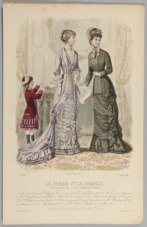 - Платья для визитов (Visiting dress) — поскольку визиты обычно наносили до полудня, платье должно было отвечать правилам дневного туалета (отсутствие декольте, открытых плеч и рук). Платье для визитов обязательно дополнялось шляпкой и перчатками.
