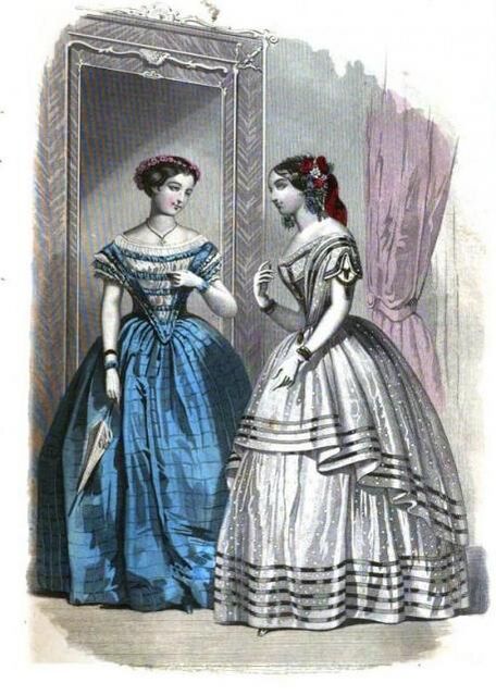 В 1850-е года силуэт, в целом, остаётся прежним, претерпевая незначительные изменения. Длина талии становится естественной, линия плеч — заниженной, а объём платья продолжает увеличиваться. В период между 1851—1856 годами для летних платьев использовали муслин, тарлатан и другие ткани, после 1852 года платья стали шить из новых тканей, называемых «ла газ кристал» (la gaze cristal), сотканных из нитей двух различных цветов, тканных одновременно. Это были: переливчатые тафты, дамаст, парча, сатин, но прежде всего — шёлк, особенно ценился лионский, который тогда приобрёл новую славу и считался очень хорошим материалом для домашних, дорожных, дневных и вечерних платьев.