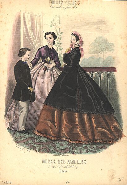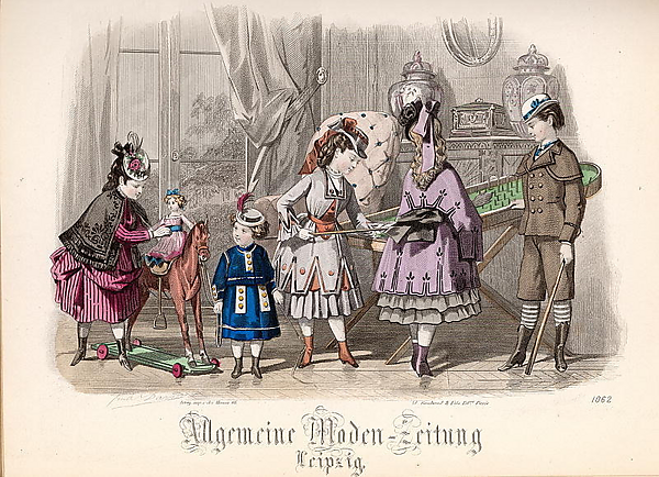 Детская мода викторианского периода в общих чертах копировала взрослую, но в ней уже не было той громоздкости прошлых веков[32]. В середине викторианской эпохи детская одежда начала появляться в журналах мод и на цветных иллюстрациях самых модных образцов сезона.