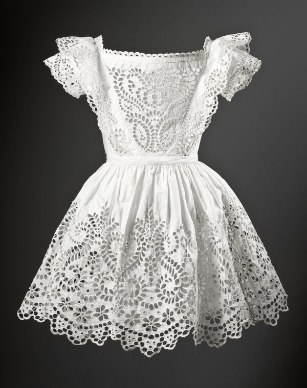 В 60-е и 70-е годы XIX века в моде были платья для девочек в стиле Алисы, персонажа книг Льюиса Кэрролла[38]. Костюм Алисы на иллюстрациях Джона Тенниела представлял собой простое однотонное платье с короткими рукавами, пышной юбочкой и передником. Передник или сарафан предназначался для того, чтобы ребёнок не испачкал и не порвал платье.