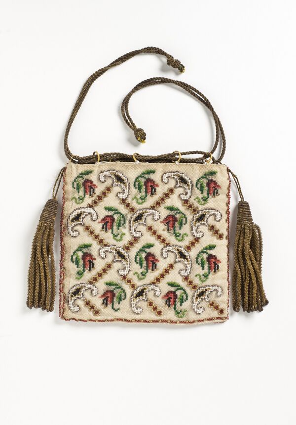 - Сумочки были преимущественно небольшого размера в виде ридикюлей и напоминающих их кошельков на ленте или цепочке. Сумочки и кошельки изготавливались, как правило, из ткани и украшались вышивкой.