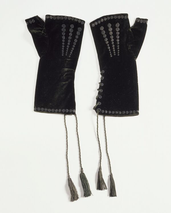 - Перчатки являлись обязательным элементом выходного костюма для соблюдения приличий. «Советы по этикету», изданные в 1837 году, давали рекомендации относительно перчаток как мужчинам, так и женщинам[27] В справочниках была информация не только о том, когда следует носить перчатки, но и какие перчатки надевать по определённому поводу. Перчатки без пальцев — митенки — были популярны в 1870-е годы; изготавливались чаще всего из чёрного кружева и по длине могли доходить до середины предплечья или до локтей. Митенки подходили для более торжественных случаев, чем обычные перчатки, например, для похода в театр или на званый ужин. Перчатки были предпочтительнее днем, а митенки — вечером. С митенками можно было свободно носить кольца, а в то время как обычные перчатки могли дополняться браслетами. Также, перчатки быстро пачкались, поэтому в справочнике «Как одеваться подобно леди на 15 фунтов в год» (1874) городским жительницам была дана рекомендация держать в гардеробе 7 пар лайковых перчаток. Предпочтительные цвета: белые, бежевые и жёлтые. В 1850-е годы в моду вошли цветные перчатки, хоть их порою считали вульгарными. В 1854 году рекламировались такие цвета, как гранатовый, Наполеон, смородиновый, оливковый, Аделаида, рубиновый, каштановый, кофейный, миртовый[27].